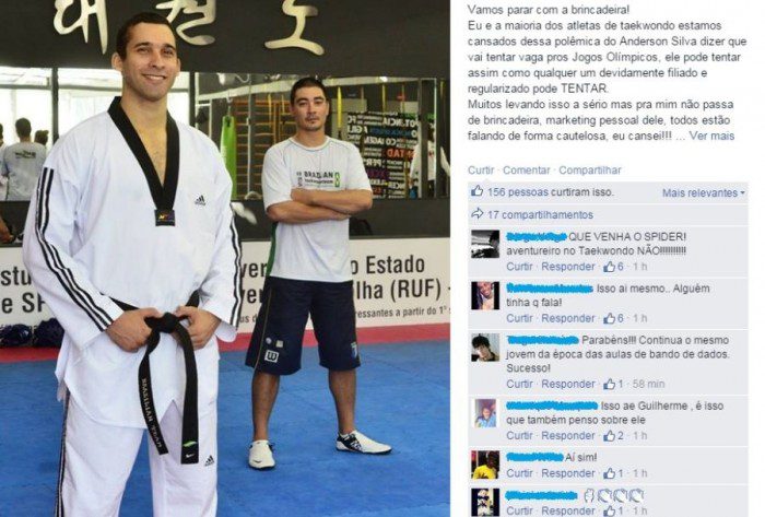 O brasileiro postou o seguinte texto via rede social: “Eu e a maioria dos atletas de taekwondo (sic) estamos cansados dessa polêmica do Anderson Silva dizer que vai tentar vaga pros Jogos Olímpicos. Ele pode tentar, assim como todos os devidamente filiados e regularizados no esportes. Se ele quer mesmo disputar uma chance nas Olimpíadas, que venha. O risco é dele e acho que vai ter que se preparar muito para não passar vergonha. Aqui não vai ter mais piadinha e brincadeira com coisa séria”.